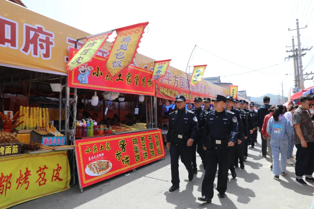 庙会现场人声鼎沸,商户云集,每日执勤民警定人、定岗、定责,他们警容严整、认真履职,全力维护现场秩序、疏导群众和车辆,切实将各项安保措施落实到位。