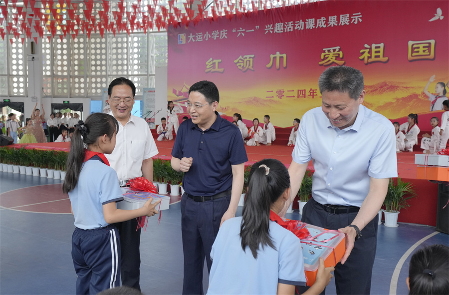大运小学校园里充满欢快向上的气息。储祥好察看校园环境,听取学校办学理念、课程体系等情况介绍,观摩舞蹈、绘画、阅读、跆拳道等兴趣活动课成果展示。看到孩子们自信自强、朝气蓬勃的精神风貌,储祥好十分高兴,为孩子们赠送节日礼物,并勉励大家认真学习知识,丰富兴趣爱好,争当德智体美劳全面发展的新时代好少年。储祥好说,小学是培养孩子全面发展的黄金时期。要全面落实立德树人根本任务,注重学生全方位发展,加强品德培养、体魄锻炼、知识学习、意志磨炼,让每个孩子都有人生出彩的机会。