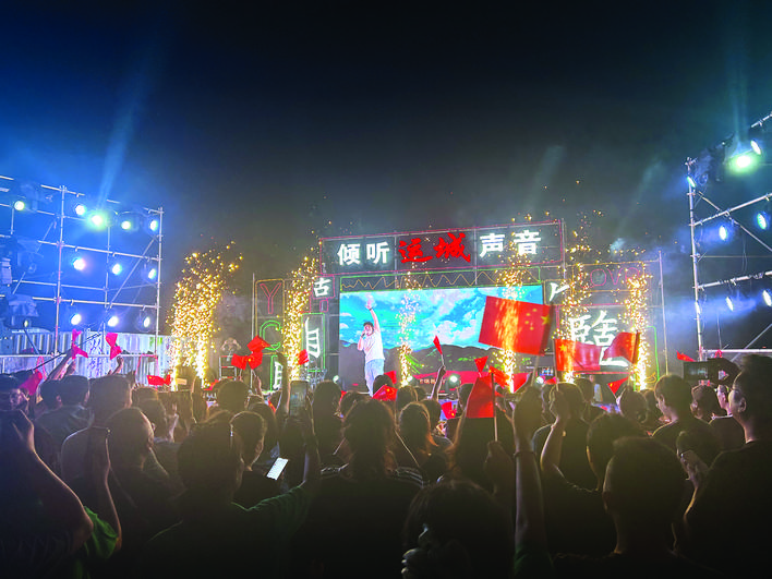 “我和我的祖国,一刻也不能分割,无论我走到哪里,都流出一首赞歌……”随着歌手华峰的歌声响起,刻在中国人DNA里的记忆被唤起,观众们不自觉地跟着哼唱,许多人手里拿着小红旗不停挥舞,脸上贴着国旗贴纸的小朋友骑在大人肩头也在哼唱……