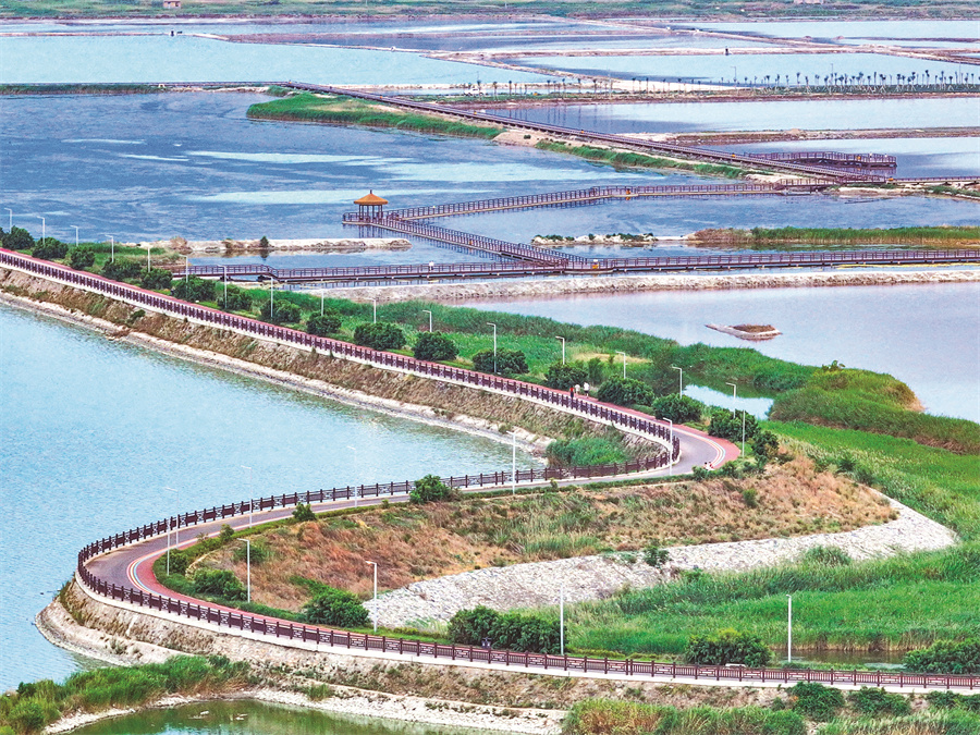 夏日炎炎,盐湖区鸭子池湿地公园内,市民们骑行或漫步在蜿蜒的彩虹步道上,尽享湖风送爽的惬意时光。 近年来,运城市大力推进鸭子池湿地公园生态修复工程,通过系统实施水系连通、水质净化、植被恢复和生物多样性保护,昔日的退化区域已蝶变为生机勃勃的城市“绿肾”。记者 常 奇 摄