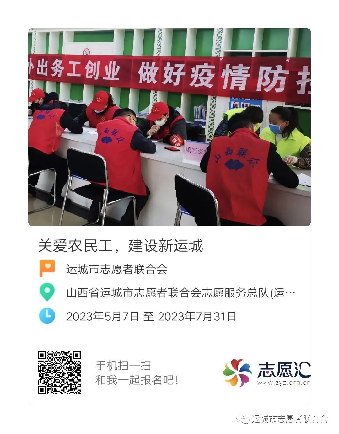 参加活动流程 志愿者参加活动流程: ❖根据自己的实际情况,将姓名、志愿服务领域、个人特长、联系电话、居住地及个人简介信息发送至运城市志愿者联合会秘书处常务副秘书长微信,联系电话:15835934759(微信同号)。 农民工参加活动流程: ❖请农民工扫描下方二维码,信息填写完整后发电子版送至邮箱:yczyzmsc@163.com。也可以现场找志愿者填写纸质版资料。