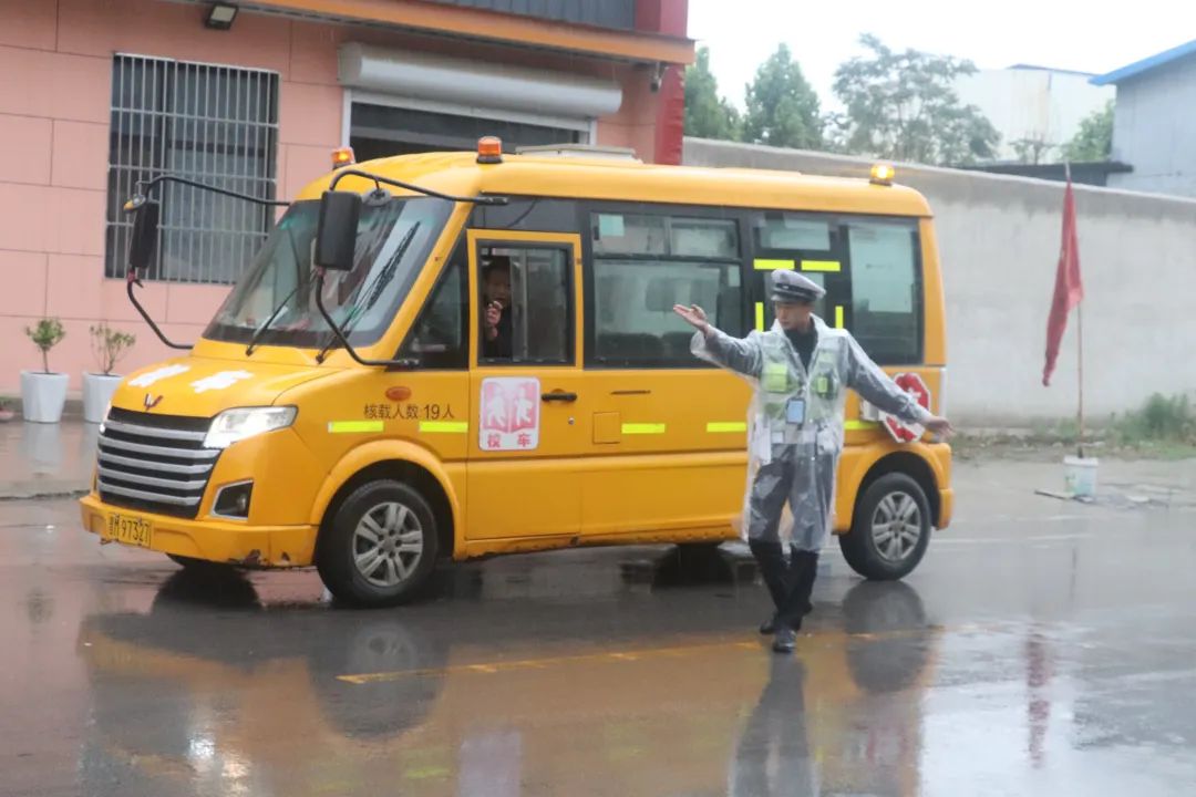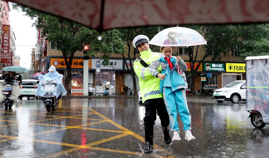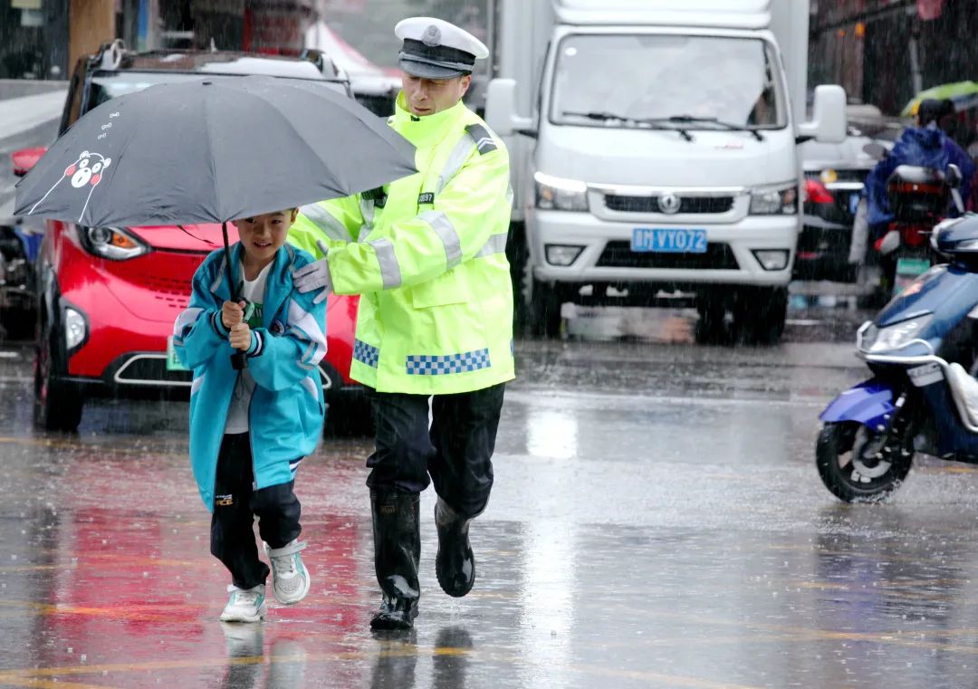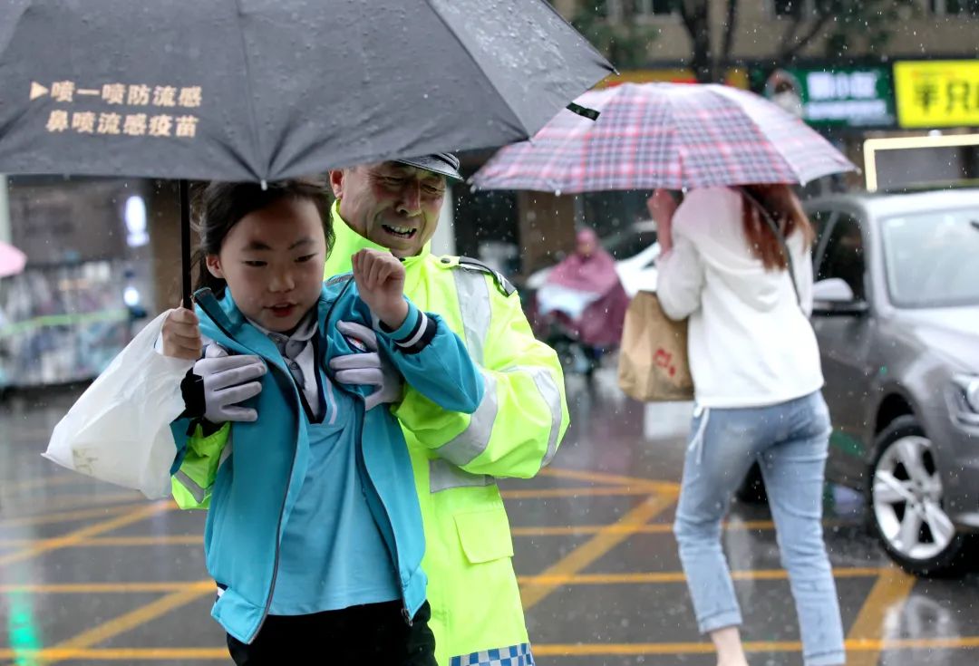 雨天送孩子上学、放学的车辆剧增,给校园周边道路交通造成了压力。运城交警在雨中忙碌地指挥过往车辆,护送学生安全通过马路,确保学校门前及周边道路交通安全顺畅。