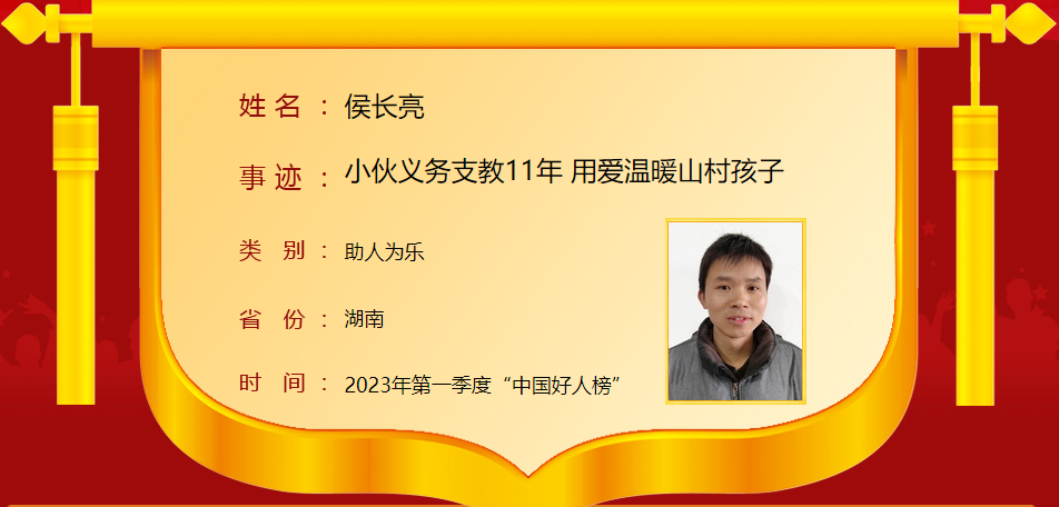 侯长亮,男,1986年2月生,中共党员,湖南省邵阳市洞口县黄桥镇四合村村民。2011年,侯长亮大学毕业后,先后在广西河池、贵州毕节和云南昭通等偏远山村义务支教11年,为山村的孩子送去爱和教育,给他们带来走出大山的希望。侯长亮曾获得云南省关心下一代工作先进个人、湖南好人等荣誉。