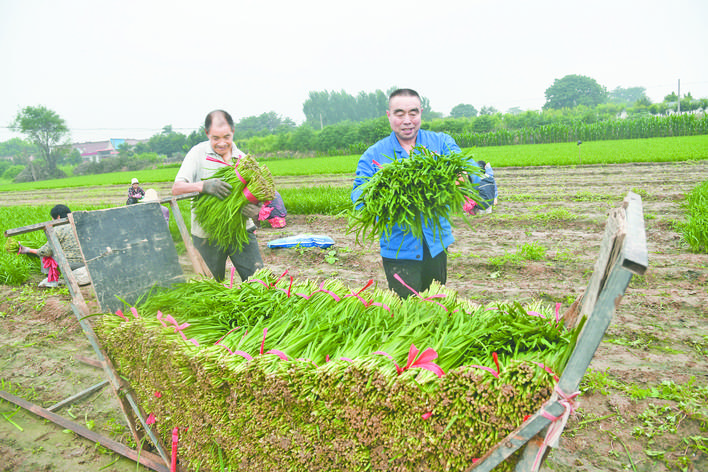 7月4日,闻喜县东镇裴村村民在收割大田韭菜。 近年来,东镇立足当地独特的资源优势,通过“支部+合作社+基地+农户”的模式,提供技术培训、资金扶持、土地流转、统一销售等系列化服务,培育形成多个以山药、芦笋、莲菜、韭菜为主的特色产业村,不断带动农民增收,助力乡村振兴。摄影 温徐旺 摄